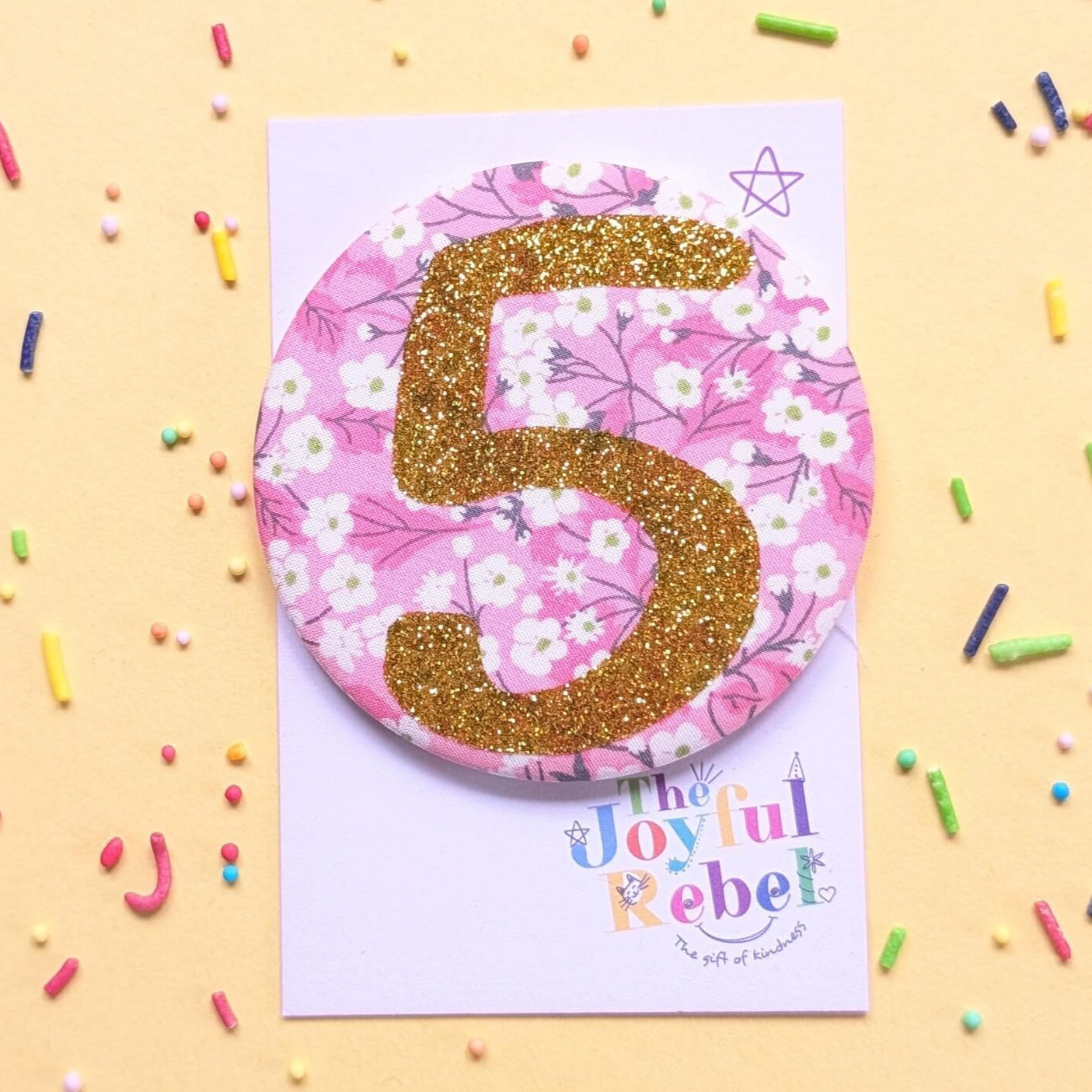Custom Glitter Age Birthday Badge – Liberty Fabric Party Accessory for Kids and Adults