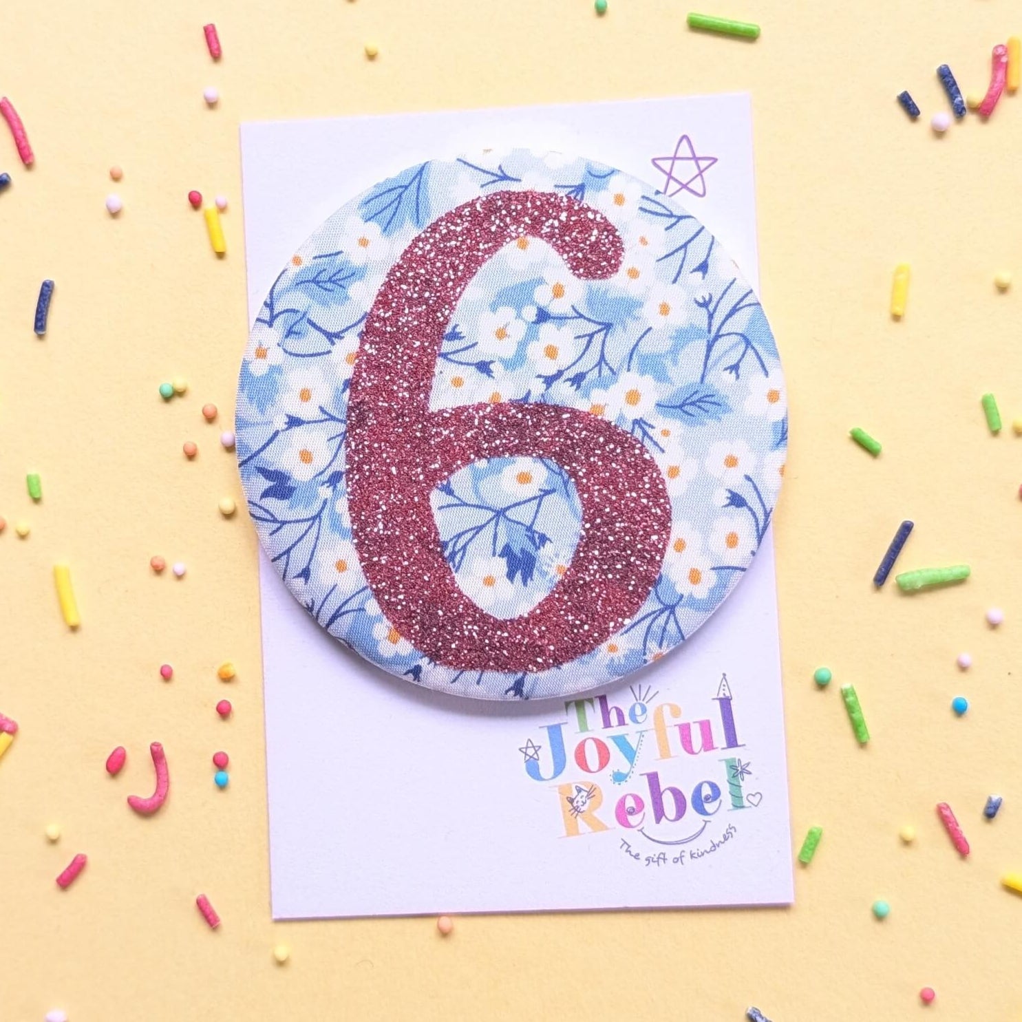 Custom Glitter Age Birthday Badge – Liberty Fabric Party Accessory for Kids and Adults