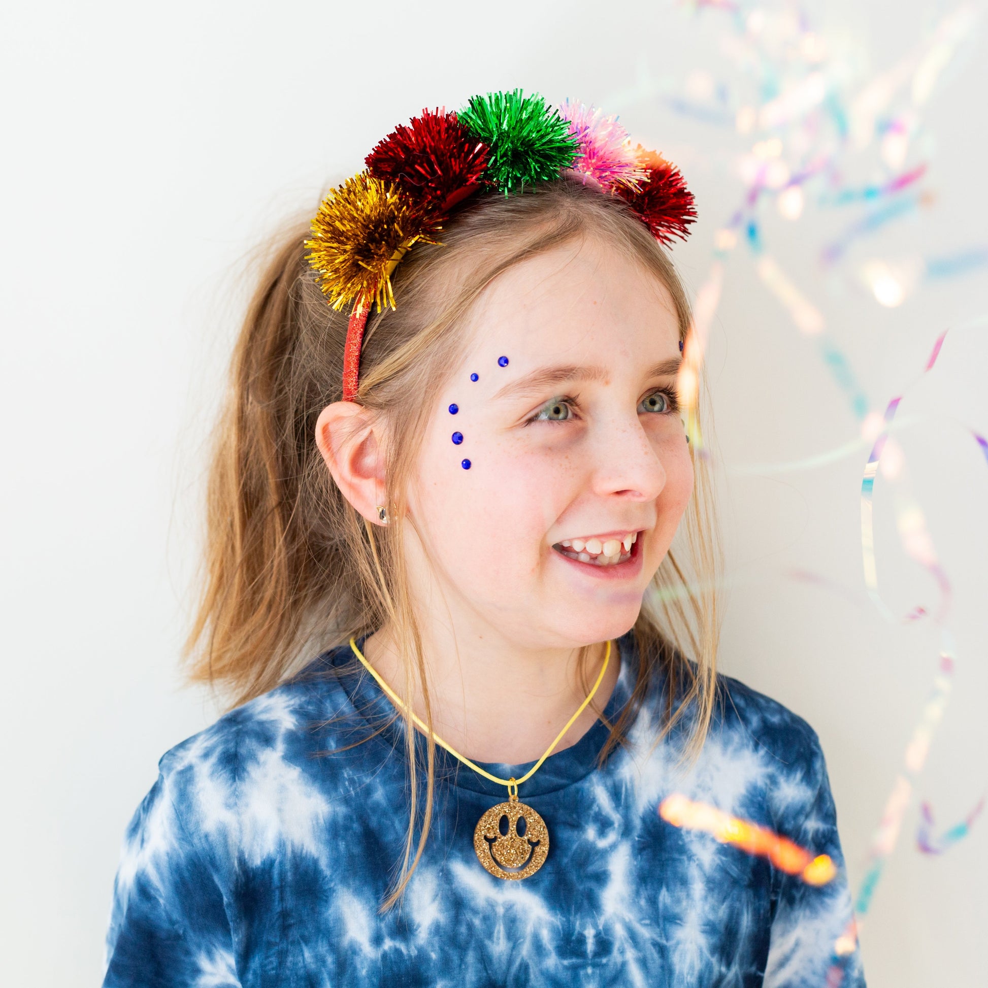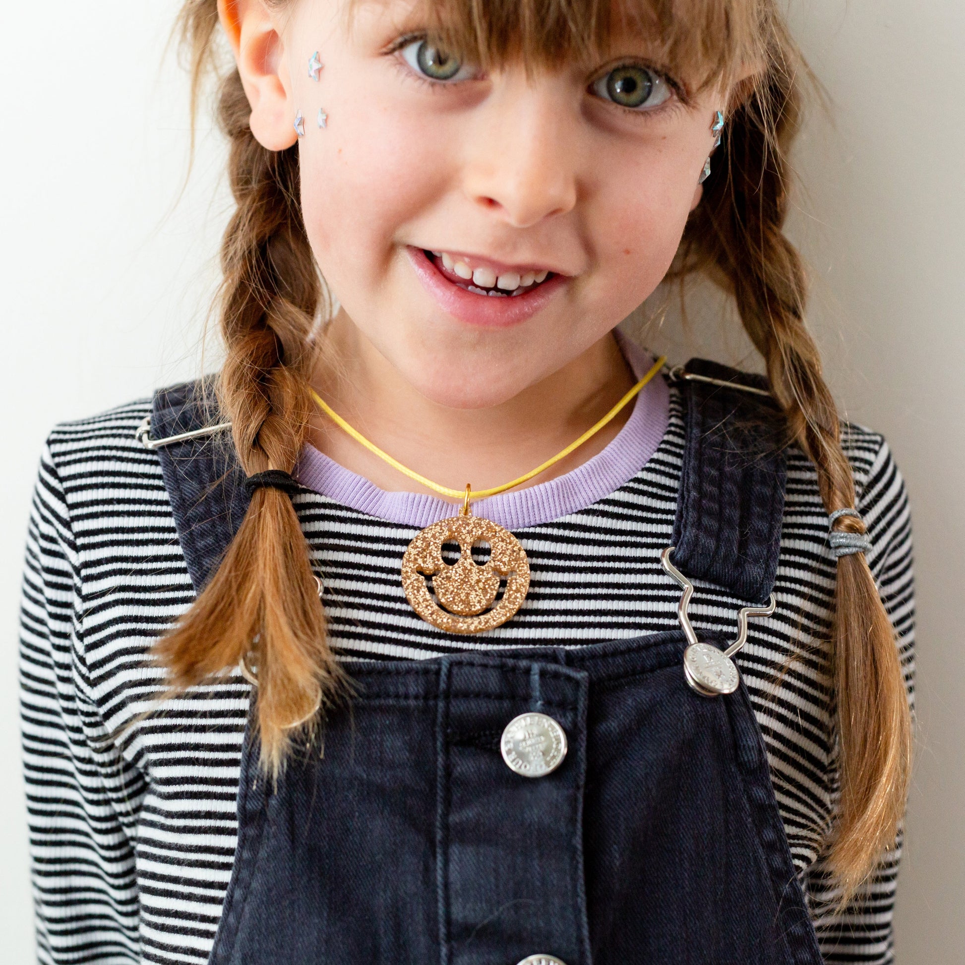 Introducing a beautiful 80s smiley face necklace with gold glitter and a vibrant cotton cord, perfect for any occasion! The necklace features a stunning gold glittery smiley face attached to the cord, making it an ideal gift for anyone. This lovely necklace is guaranteed to bring a smile to anyone's face.