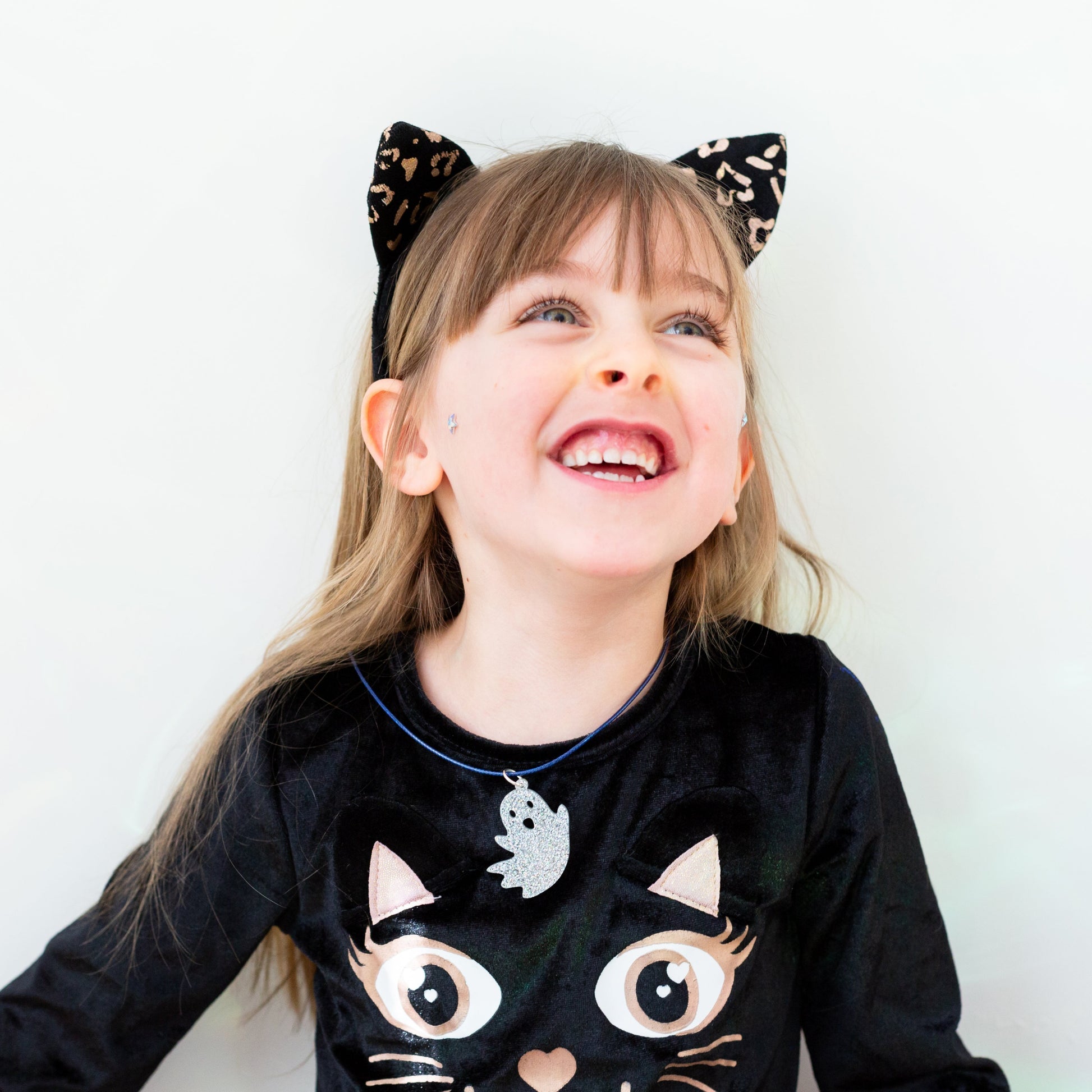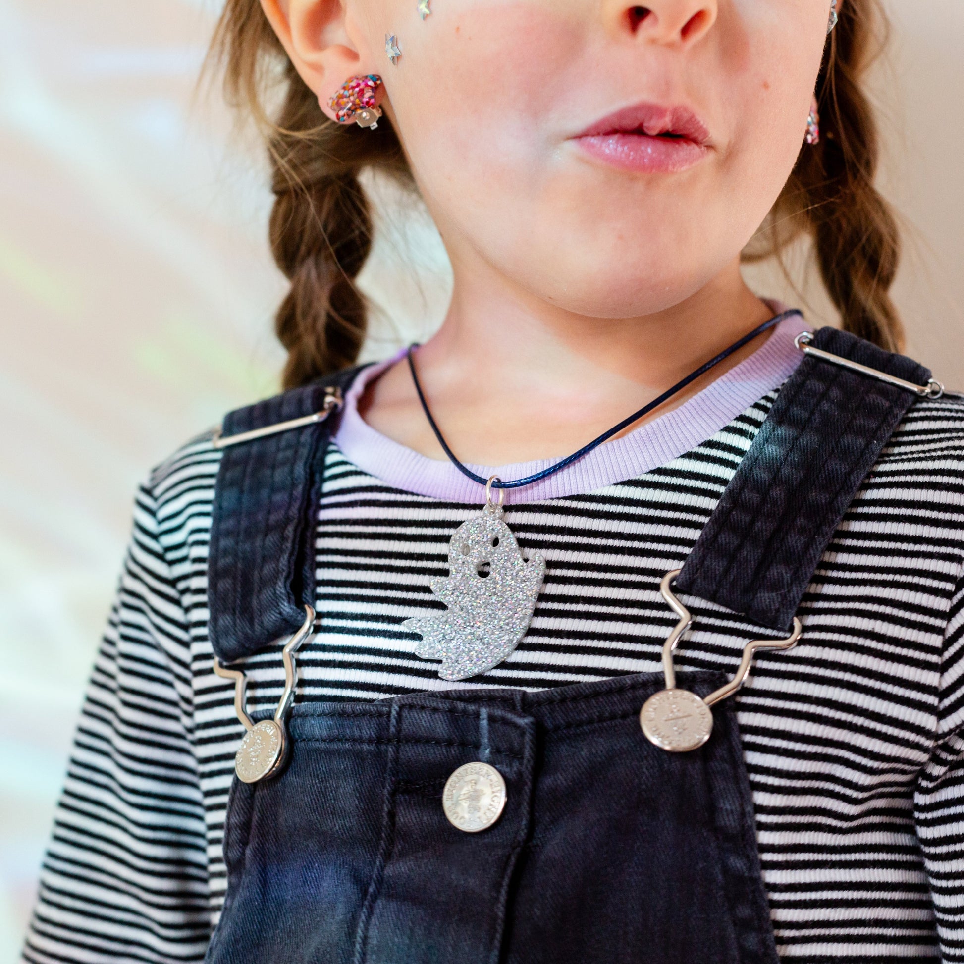 Introducing a beautiful ghost necklace with silver glitter and a vibrant cotton cord, perfect for any occasion.Introducing a stunning silver glittery ghost necklace. The super-friendly ghost is attached to a vibrant cotton cord, making it an ideal gift for any occasion. This lovely necklace is guaranteed to bring a smile to anyone's face.
