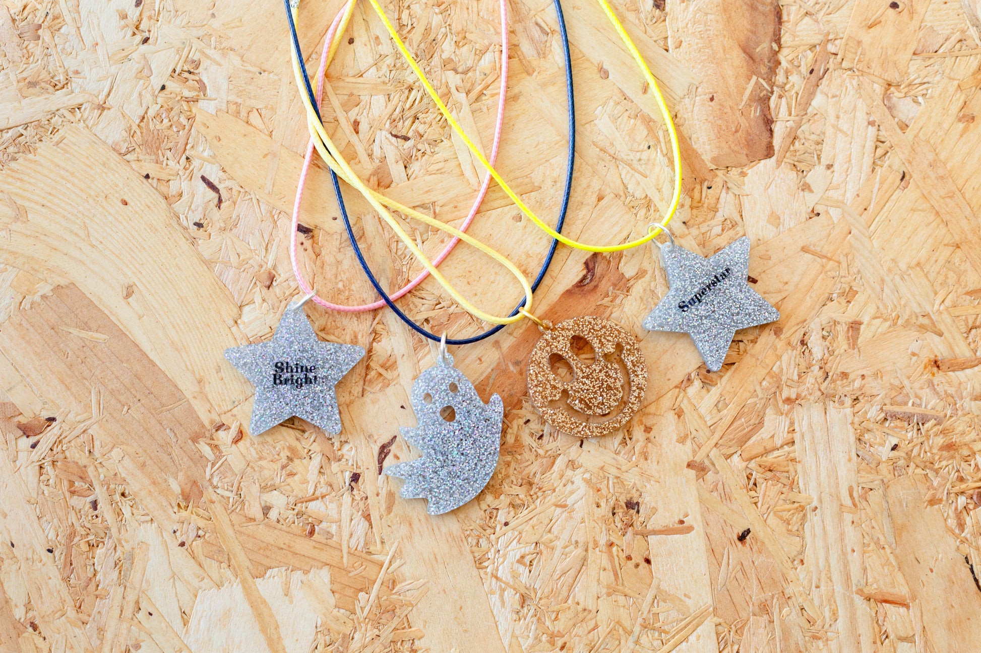 Each necklace is crafted from lightweight, glittery laser-cut plastic. The adjustable cord is made from waxed cotton with a metal clasp.